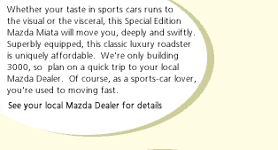 (Note: We "borrowed" the source for this page from the Mazda page. We did not make this, we do not own it, we just put it here in case the link in the Mazda site disappears with the new model year. Credit for this beautiful page goes to the Mazda marketing folks. Just in case... :) |